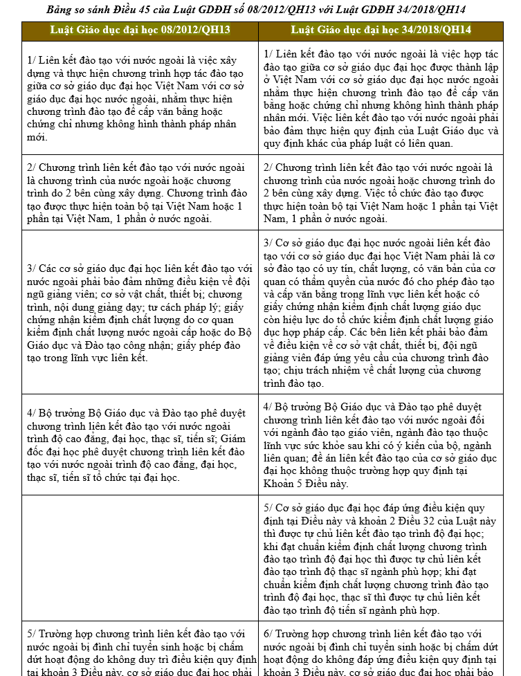 • Đến ngày 19 tháng 11 năm 2018, căn cứ vào Hiến pháp nước Cộng hòa Xã hội Chủ nghĩa Việt Nam, Quốc hội ban hành Luật sửa đổi, bổ sung một số điều của Luật Giáo dục đại học số 08/2012/QH13 đã được sửa đổi, bổ sung một số điều theo Luật số 32/2013/QH13, Luật số 74/2014/QH13 và Luật số 97/2015/QH13; Luật số 34/2018/QH14 Sửa đổi, bổ sung một số điều (của Luật Giáo dục đại học trước đó) có 03 điều. Tại Điều 1 của Luật số 34/2018/QH14 ngoài sửa đổi nội dung các khoản trong Điều 45 Chương 6 Hoạt động hợp tác quốc tế của Luật 08/2012/QH13, còn bổ sung thêm 02 khoản, cụ thể: Khoản 5 xác định nếu cơ sở giáo dục đại học đáp ứng điều kiện quy định tại Điều 45 và khoản 2 Điều 32 của Luật 34/2018/QH14 thì được tự chủ liên kết đào tạo trình độ đại học, khi đạt chuẩn kiểm định chất lượng chương trình đào tạo trình độ đại học thì được tự chủ liên kết đào tạo trình độ thạc sĩ ngành phù hợp; và tương tự như vậy khi liên kết đào tạo trình độ tiến sĩ; khoản 8 hàm chứa nội dung cơ sở giáo dục đại học tự liên kết đào tạo khi chưa bảo đảm điều kiện theo quy định hoặc vi phạm điều kiện bảo đảm chất lượng chất lượng giáo dục trong đề án liên kết đào tạo với nước ngoài thì bị đình chỉ hoạt động liên kết đào tạo, không được tự chủ liên kết đào tạo với nước ngoài trong thời hạn 05 năm kể từ khi có kết luận về việc vi phạm của cơ quan có thẩm quyền.