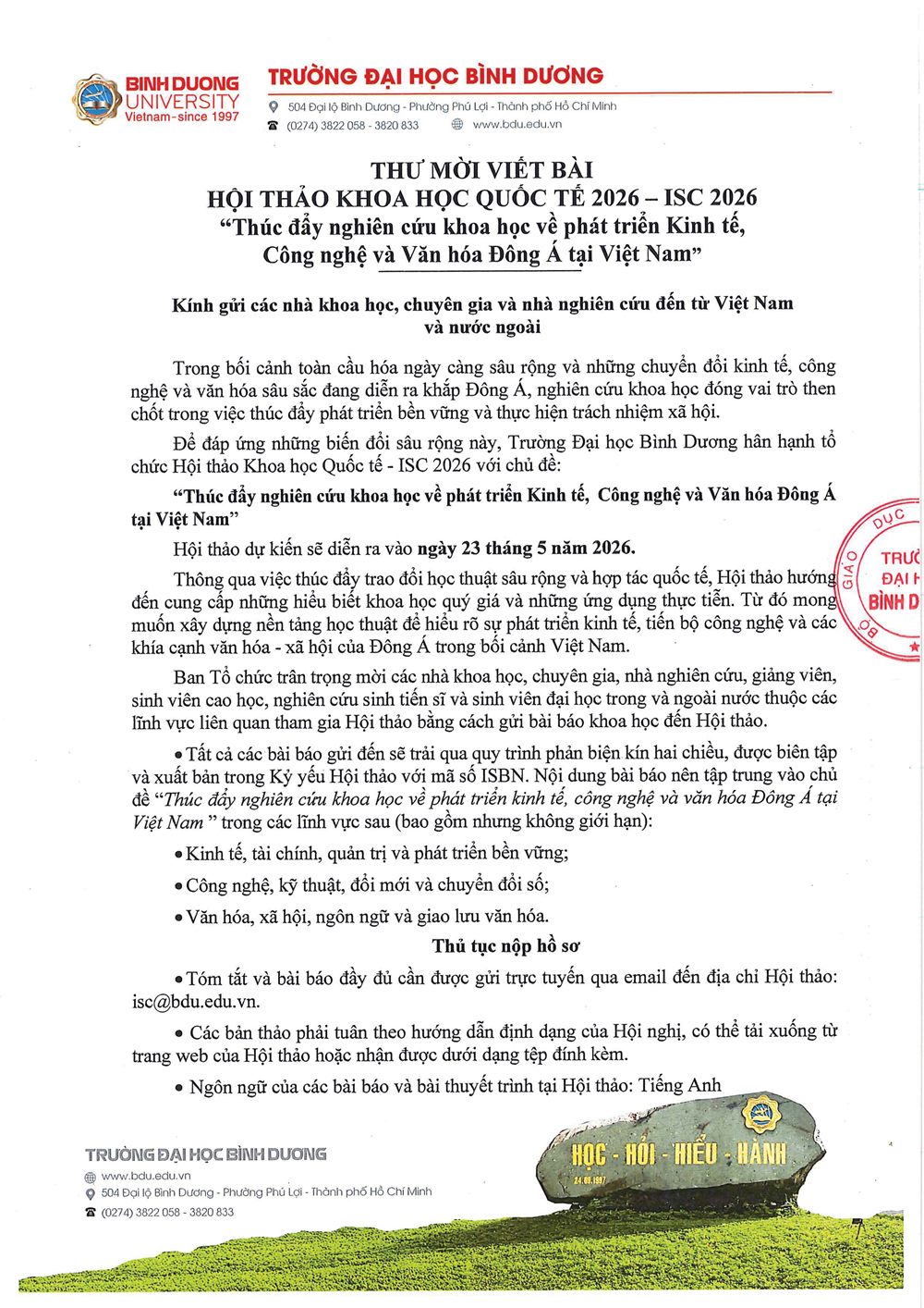 Trong bối cảnh toàn cầu hóa ngày càng sâu rộng cùng những chuyển dịch mạnh mẽ về kinh tế, công nghệ và văn hóa trên toàn thế giới, nghiên cứu khoa học đóng vai trò then chốt trong việc thúc đẩy phát triển bền vững và thực hiện trách nhiệm xã hội. Để đồng hành cùng những biến đổi này, Trường Đại học Bình Dương trân trọng tổ chức Hội thảo Khoa học Quốc tế ISC 2026 với chủ đề "Thúc đẩy nghiên cứu khoa học và phát triển Kinh tế, Công nghệ và Văn hóa đương đại tại Việt Nam".