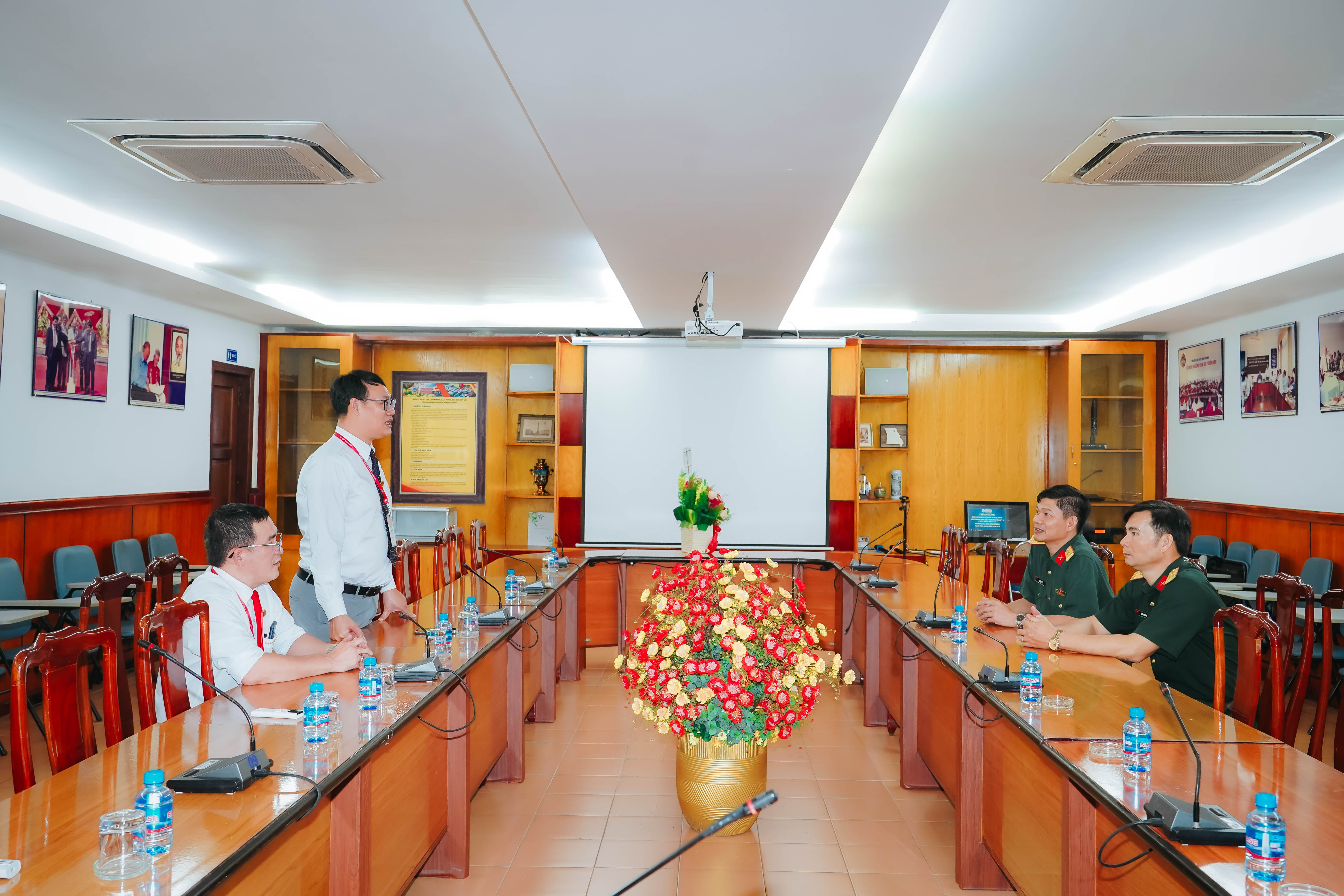 Thay mặt Ban Giám hiệu và toàn thể cán bộ, giảng viên, PGS.TS Lê Văn Cường – Phó Hiệu trưởng, TS. Đỗ Đoan Trang – Phó Hiệu trưởng Thường trực và ThS. Nguyễn Ngọc Chiến - Phó Bí thư Đảng ủy, Chủ tịch Công đoàn trường đã đón tiếp các đoàn công tác, gửi lời cảm ơn sâu sắc đến các đơn vị vì sự quan tâm và động viên kịp thời nhân dịp Ngày Nhà giáo Việt Nam. Ban Giám hiệu cũng chia sẻ về những thành tựu nổi bật của nhà trường, đồng thời cam kết sẽ tiếp tục phát huy tinh thần đổi mới, sáng tạo trong giáo dục và đào tạo.