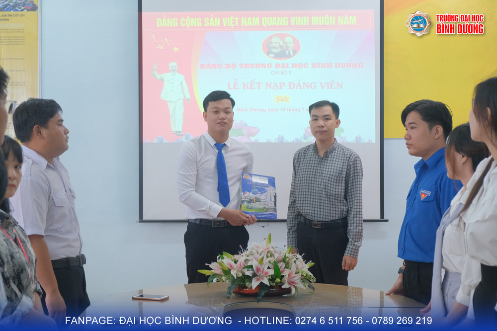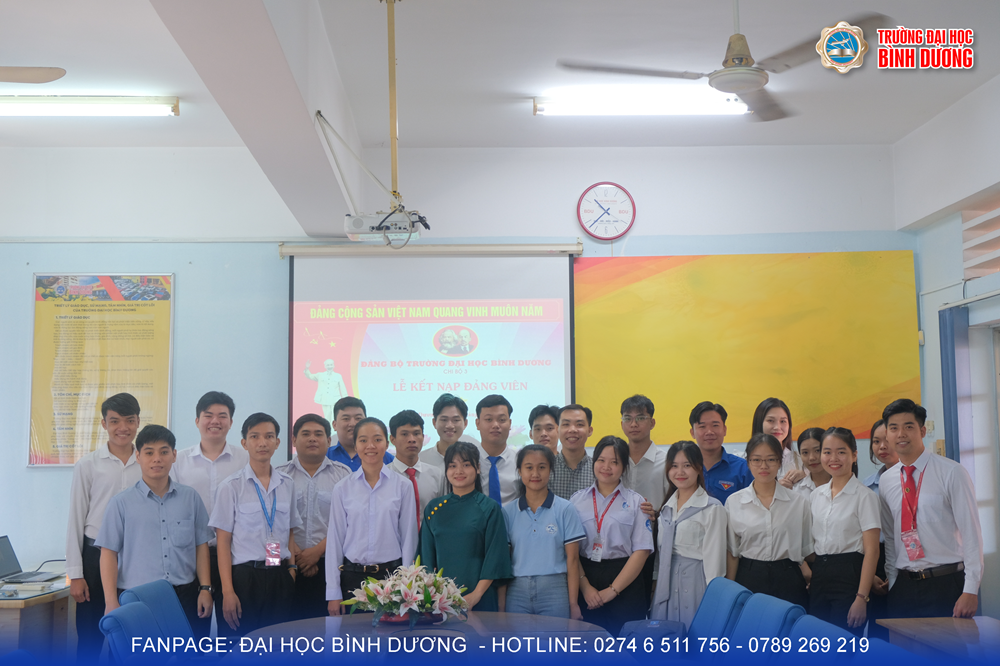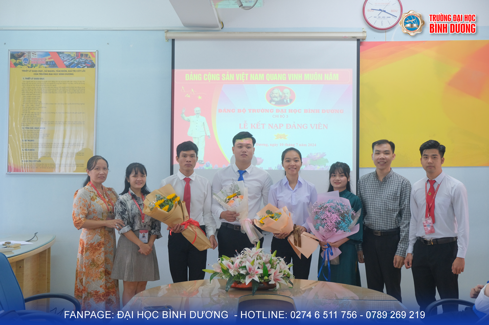 Sáng ngày 10/7/2024 tại phòng họp A2 – Trường Đại học Bình Dương, Chi bộ 03 thuộc Đảng bộ Trường Đại học Bình Dương đã tổ chức Lễ Kết nạp Đảng cho 04 Đoàn viên vào Đảng bao gồm: Nguyễn Thị Kim Chi – Chi đoàn 21DH01; Nguyễn Thị Thúy Hằng – Chi đoàn 25KT01; Nguyễn Quốc Cần – Chi đoàn 25LK01 và Huỳnh Thành Phú – Chi đoàn 24LK01 được đứng vào hàng ngũ Đảng Cộng sản Việt Nam.