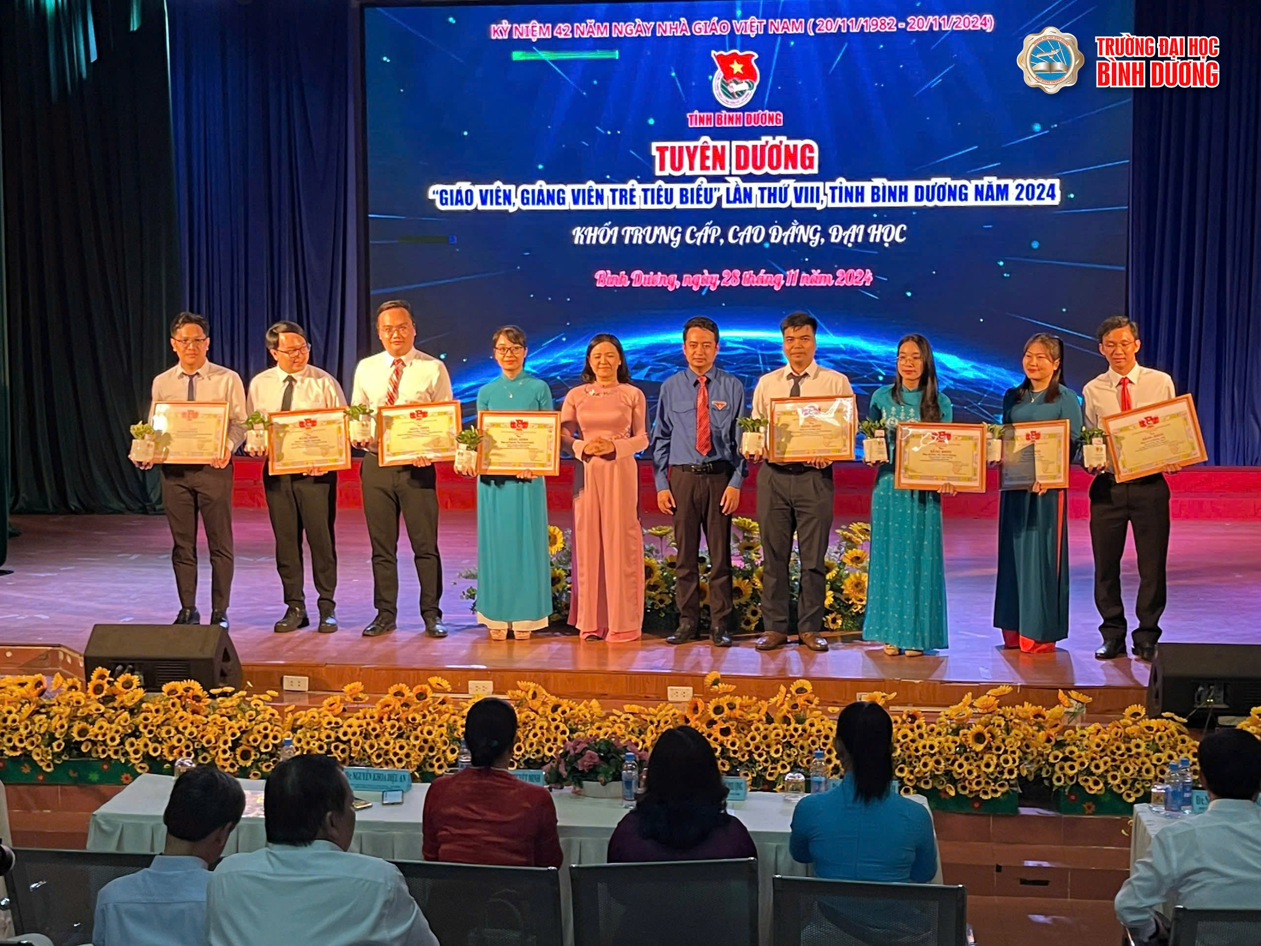 Tối 28-11, tại Nhà Thiếu nhi tỉnh Bình Dương, Lễ tuyên dương “Giáo viên, giảng viên trẻ tiêu biểu” lần thứ VIII đã diễn ra với sự tham gia của lãnh đạo tỉnh, Ban Thường vụ Tỉnh đoàn và Sở Giáo dục và Đào tạo. Đây là sự kiện nhằm tôn vinh những cá nhân xuất sắc trong ngành giáo dục, thể hiện sự ghi nhận đối với những nỗ lực của cán bộ giảng dạy trong việc nâng cao chất lượng giáo dục. Chương trình đã vinh danh 103 giáo viên và giảng viên trẻ tiêu biểu của tỉnh, trong đó Trường Đại học Bình Dương vinh dự có hai giảng viên trẻ được công nhận gồm: ThS. Vũ Đức Quý và ThS. Đinh Thị Thanh Hương được tuyên dương vì đã có sự cống hiến và nỗ lực không ngừng trong công tác giảng dạy và nghiên cứu.