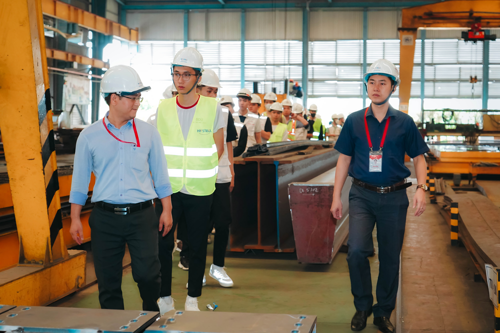 Để giúp sinh viên hiểu rõ hơn về quy trình sản xuất kết cấu thép, đại diện của doanh nghiệp đã dẫn sinh viên tham quan các khu vực xưởng cắt thép, gia công chế tạo, xưởng sơn tĩnh điện, và bãi lắp ráp thử các cấu kiện thép. Trong suốt chuyến tham quan, Ban lãnh đạo Nhà máy đã giải đáp nhiều câu hỏi của sinh viên, giúp các bạn hiểu sâu sắc hơn về ngành nghề mà mình đang theo đuổi.
