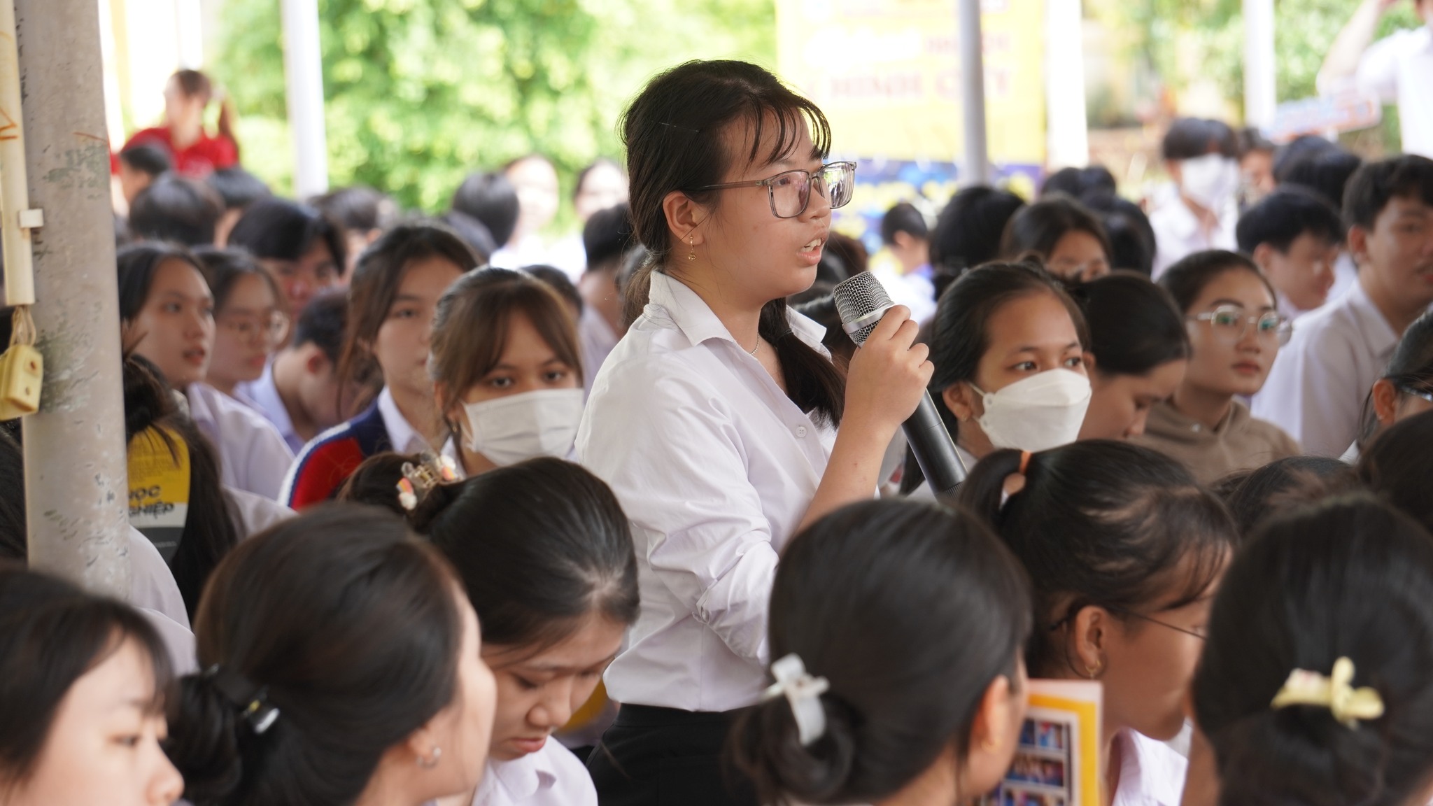 Tiến sĩ Đỗ Đoan Trang - Phó Hiệu trưởng thường trực Nhà trường tư vấn cho học sinh tại sự kiện.