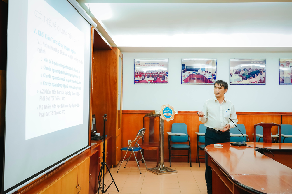 Tại buổi làm việc, Hội đồng thẩm định đã được lắng nghe Tiến sĩ Huỳnh Lời - Chủ tịch Hội đồng xây dựng chương trình đào tạo trình bày giới thiệu về Trường Đại học Bình Dương và chương trình đào tạo ngành Dược học trình độ đại học.