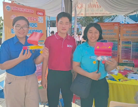 Ngoài tham luận tích hợp kỹ năng công dân số vào bài học STEM, Trường Đại học Bình Dương tham gia triển lãm với một số hoạt động STEM như: tạo thiết bị xem phim 3D, xếp hình tư duy Tangram, xe buồm chạy bằng sức gió… thu hút sự tham gia hào hứng của đông đảo giáo viên và học sinh.