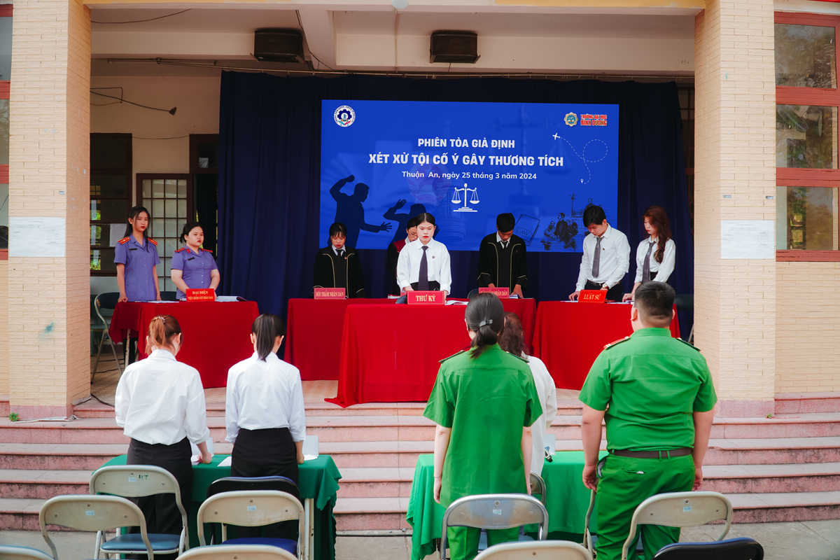 Phiên tòa giả định đã diễn ra với đầy đủ thành phần, trình tự và thủ tục theo quy định của Bộ luật Tố tụng hình sự. Các điều luật được áp dụng trong tình huống giống như phiên tòa thực tế. Từ Hội đồng xét xử đại diện Viện Kiểm sát nhân dân, thư ký phiên tòa đến bị cáo, bị hại…đều do các cán bộ, nhân viên của Tòa án nhân dân, Viện Kiểm sát nhân dân phối hợp với lực lượng đoàn viên thanh niên của Khoa Luật học nhập vai, thể hiện đúng chức năng, nhiệm vụ của mình trong phiên tòa xét xử, đảm bảo tính nghiêm minh của pháp luật.